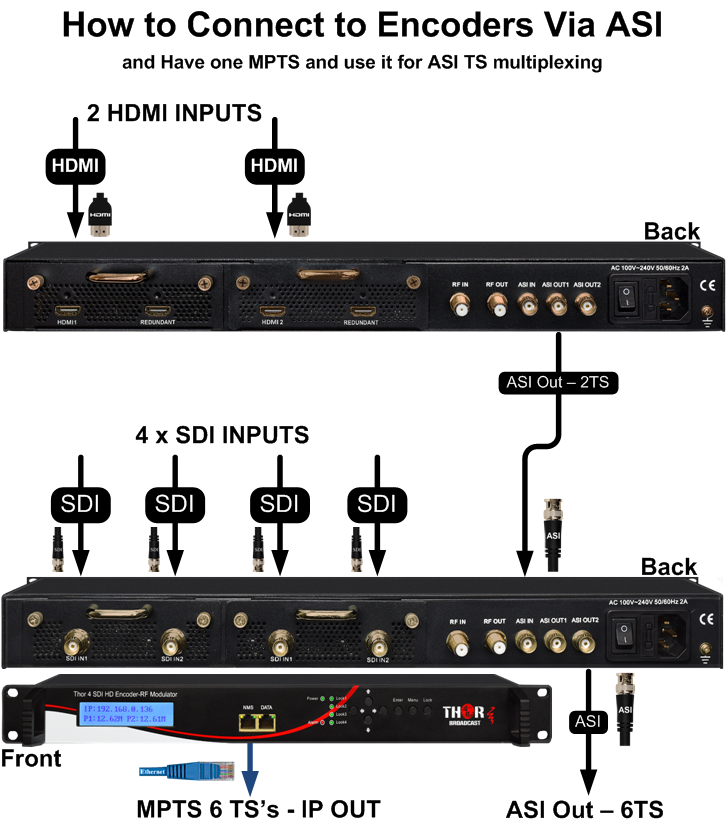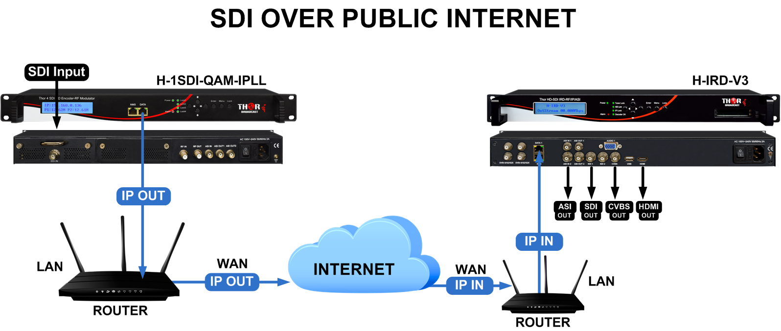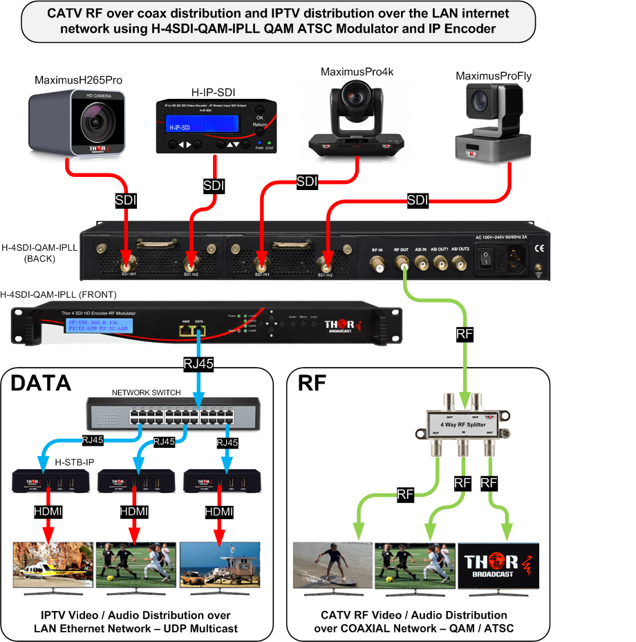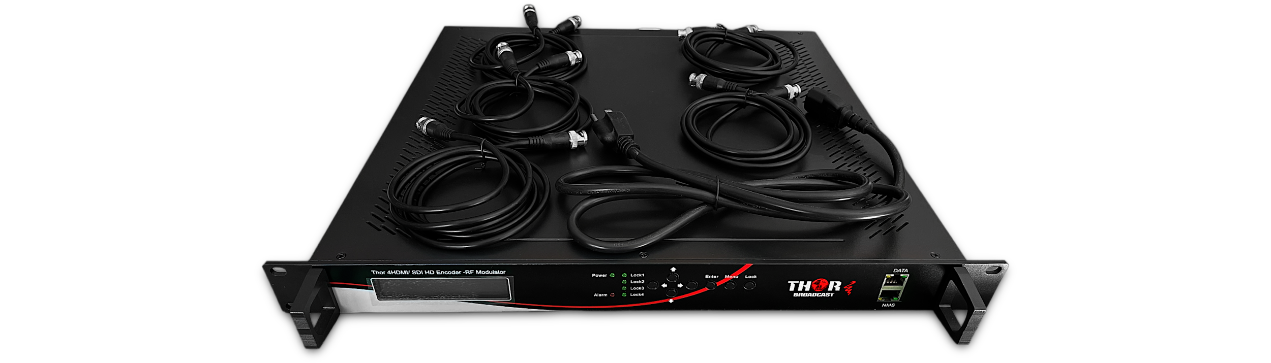 Transform your HD-SDI digital video inputs into MPEG-2 or H.264 streams with the Thor 1-4 SDI to QAM Modulators and IPTV Streaming Encoders. These devices output ASI, IP (UDP, RTP, RTSP), and RF in QAM-256 J.83A/B/C, making them suitable for US Cable format or DVB-C.