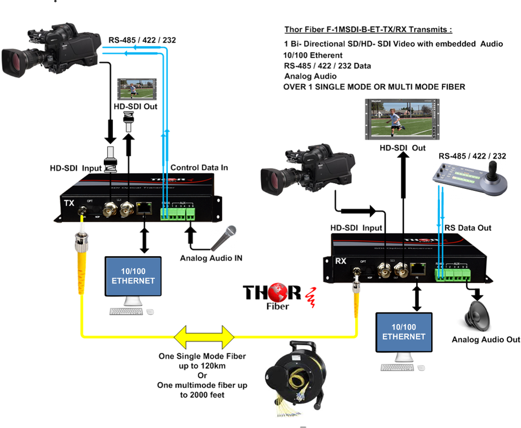 The Thor Fiber F-M1SDI-TR-ET is compact yet powerful, enabling users to transport a single channel of 1.485Gbps HD-SDI data while simultaneously transmitting 10/100Mb/s Ethernet data. This kit includes a transmitter and receiver, providing RS485 in reverse for easy control. It supports additional AUX cards for options like RS232, RS422, and external analog audio instead of SDI embedded audio.