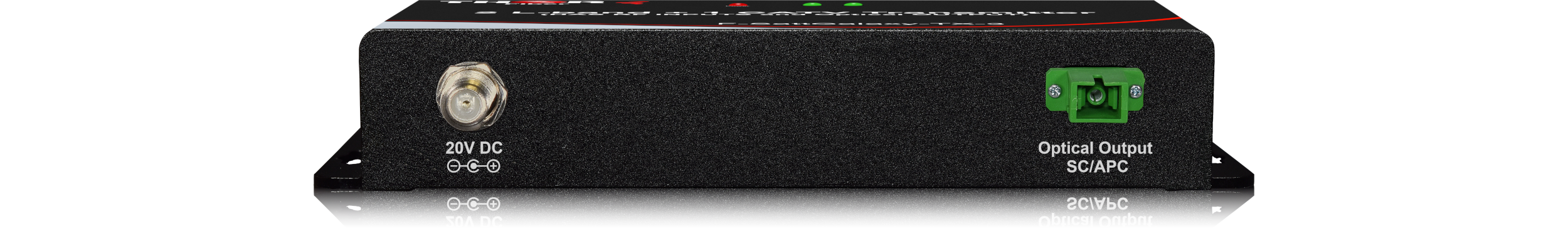 The transmitter offers high optical output power, enabling signal distribution to up to 32 optical receivers within a 10-kilometer radius. The exact number of receiving points and maximum transmission range depend on optical power budget calculations, which are model-specific. Both units use angle polish connector SC/APC to minimize reflections and maintain a clean signal connection.