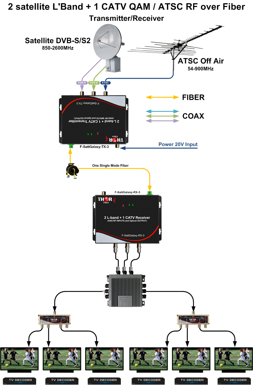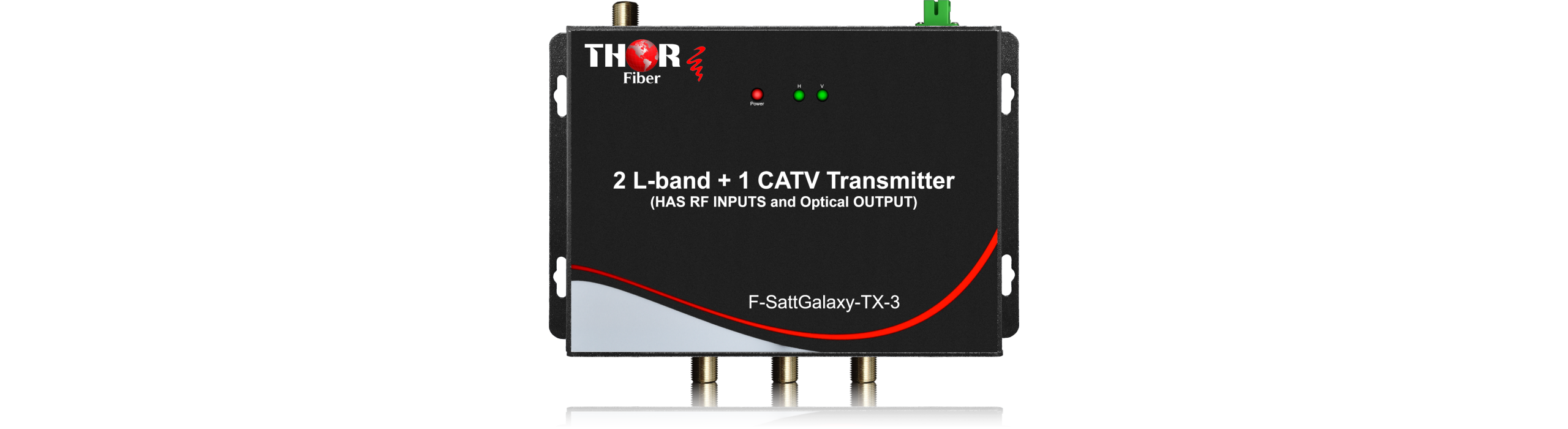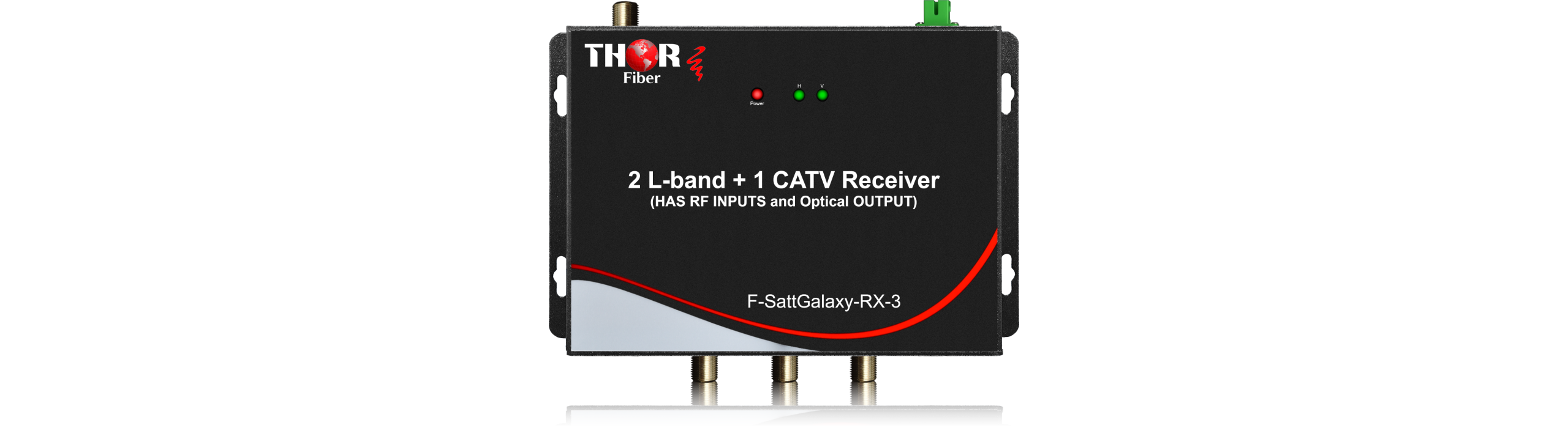 The F-SattGalaxy-TX/RX-3 is an advanced solution for converting optical signals from the F-SattGalaxy-RX-3 transmitter into electrical RF signals. This system is tailored for transmitting two LNBs and a CATV band over a single-mode fiber, utilizing plug-and-play technology with SC/APC connectors for easy setup.