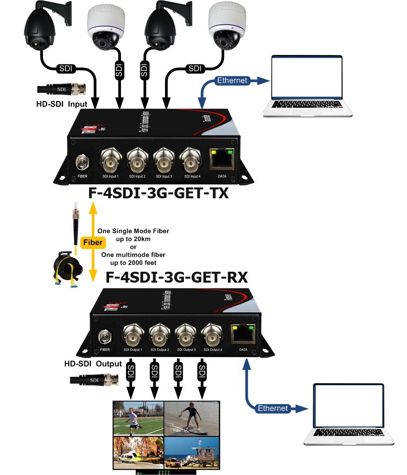 - Transmits 4 channels of 3G-SDI video and bi-directional Ethernet over one fiber strand.