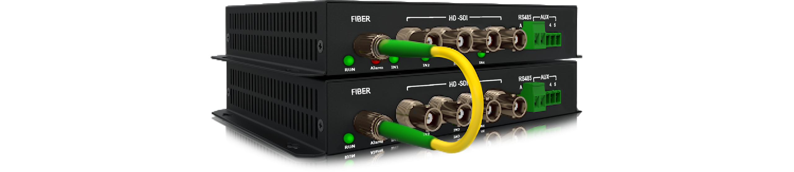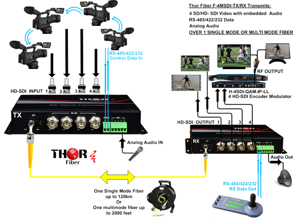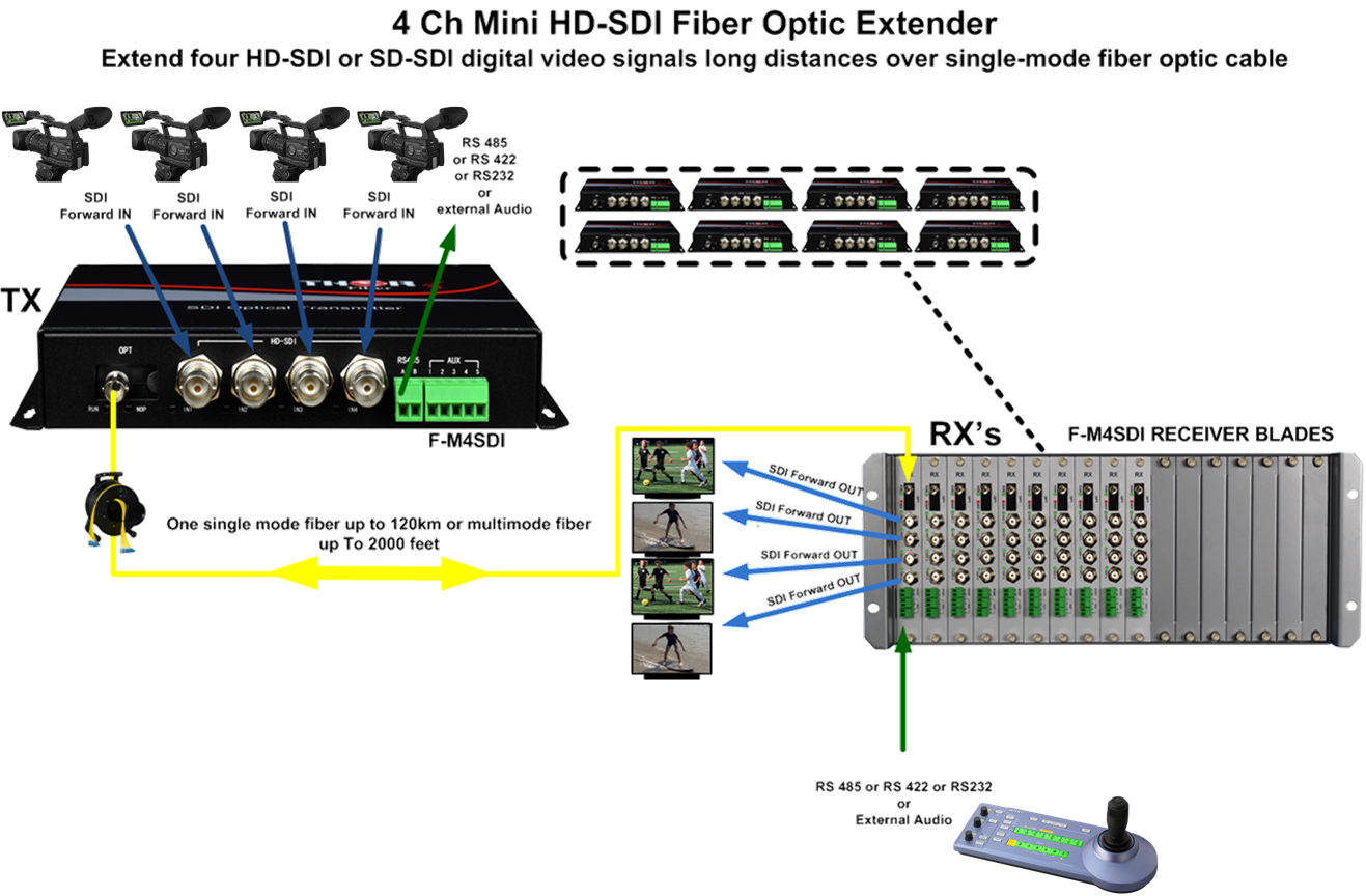 The F-M4SDI-Tx/Rx kit is designed to handle four channels of 1.485Gbps HD-SDI Serial Data Interface using a single strand of fiber. It also features a return path for RS-485, allowing for easy control. The auxiliary port offers additional flexibility, supporting options like audio, RS-232/422, or contact closure.