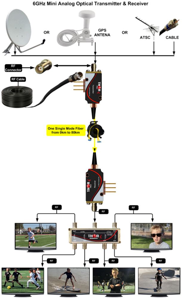 Experience seamless RF signal transport with the Thor 6GHz RF over Fiber system, designed for a range of applications including Satcom, GPS, WiMAX, LTE, and DAS. This system includes an analog RFoF optical transmitter that converts RF signals into optical signals for transmission over long distances via fiber optic cable. The optical receiver then converts these signals back to RF. Connected through a single-mode fiber, this system supports distances up to 40 km.