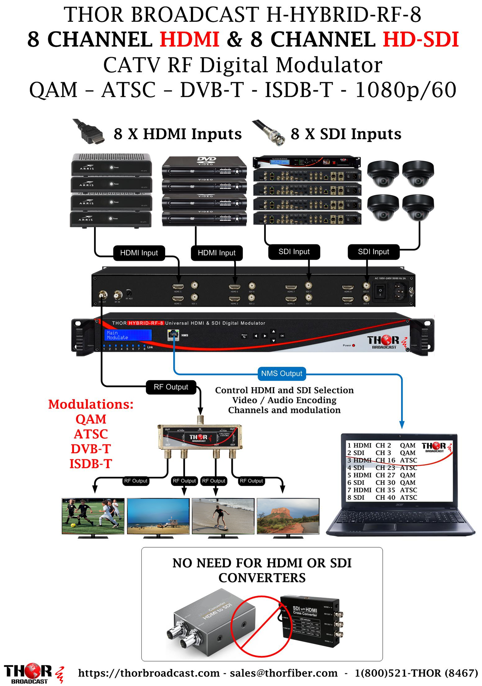Introducing the Thor 8 Channel SDI and HDMI Clear CATV RF Modulator, a versatile solution for converting up to 8 SDI or HDMI video sources into individual CATV RF channels. This unit supports DVB-C QAM, Off-Air ATSC, European DVB-T, and Latin America ISDB-T modulation standards, offering flexibility and compatibility for various broadcasting needs.