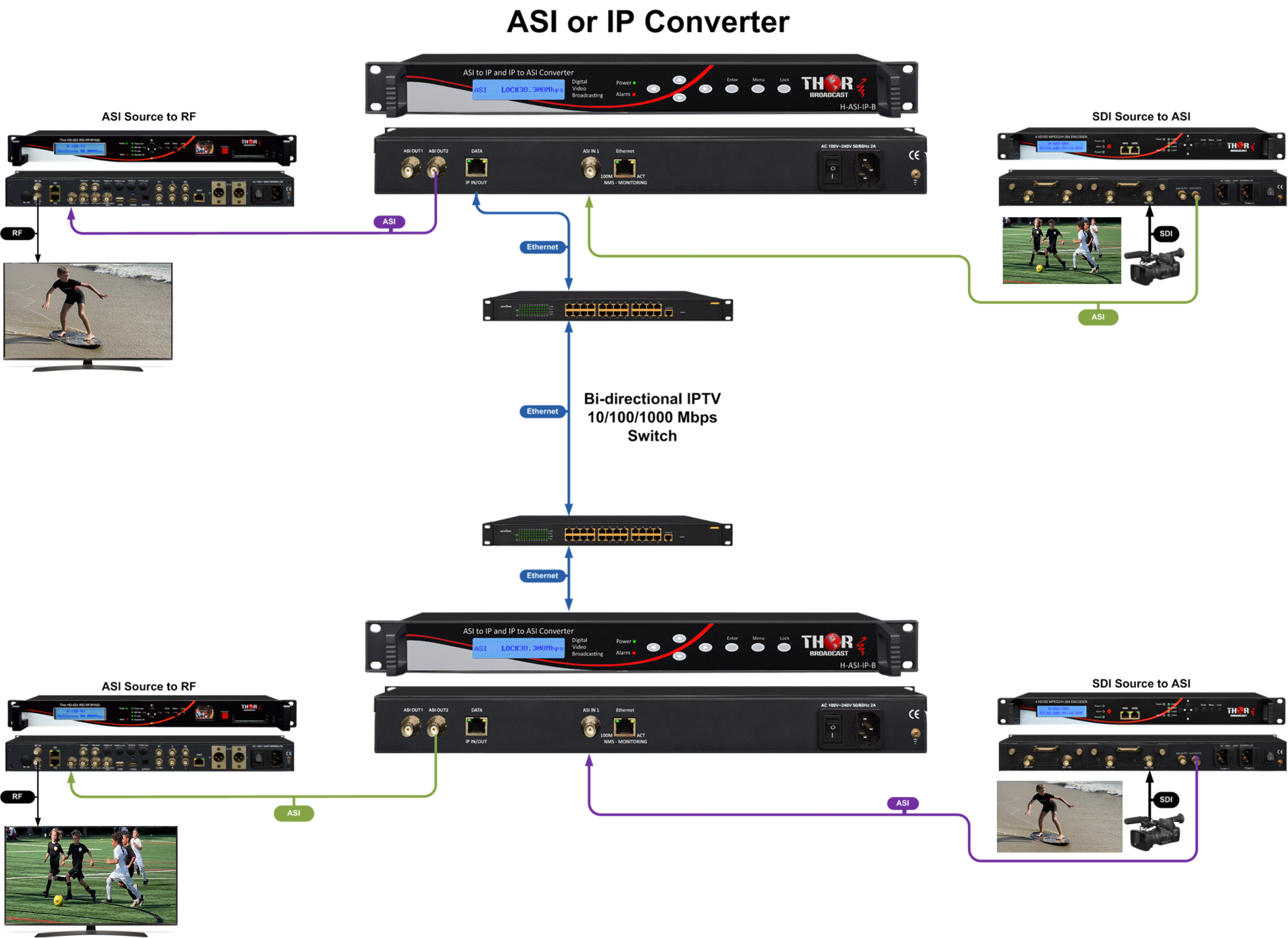 The Thor DVB ASI Over IP Gateway is a versatile solution for converting ASI to IP and IP to ASI, designed for MPEG2 and MPEG4 transport streams over Ethernet networks. This bi-directional gateway is ideal for Digital Video Broadcast systems, providing efficient distribution of digital video streams across Single Frequency Networks (SFN).