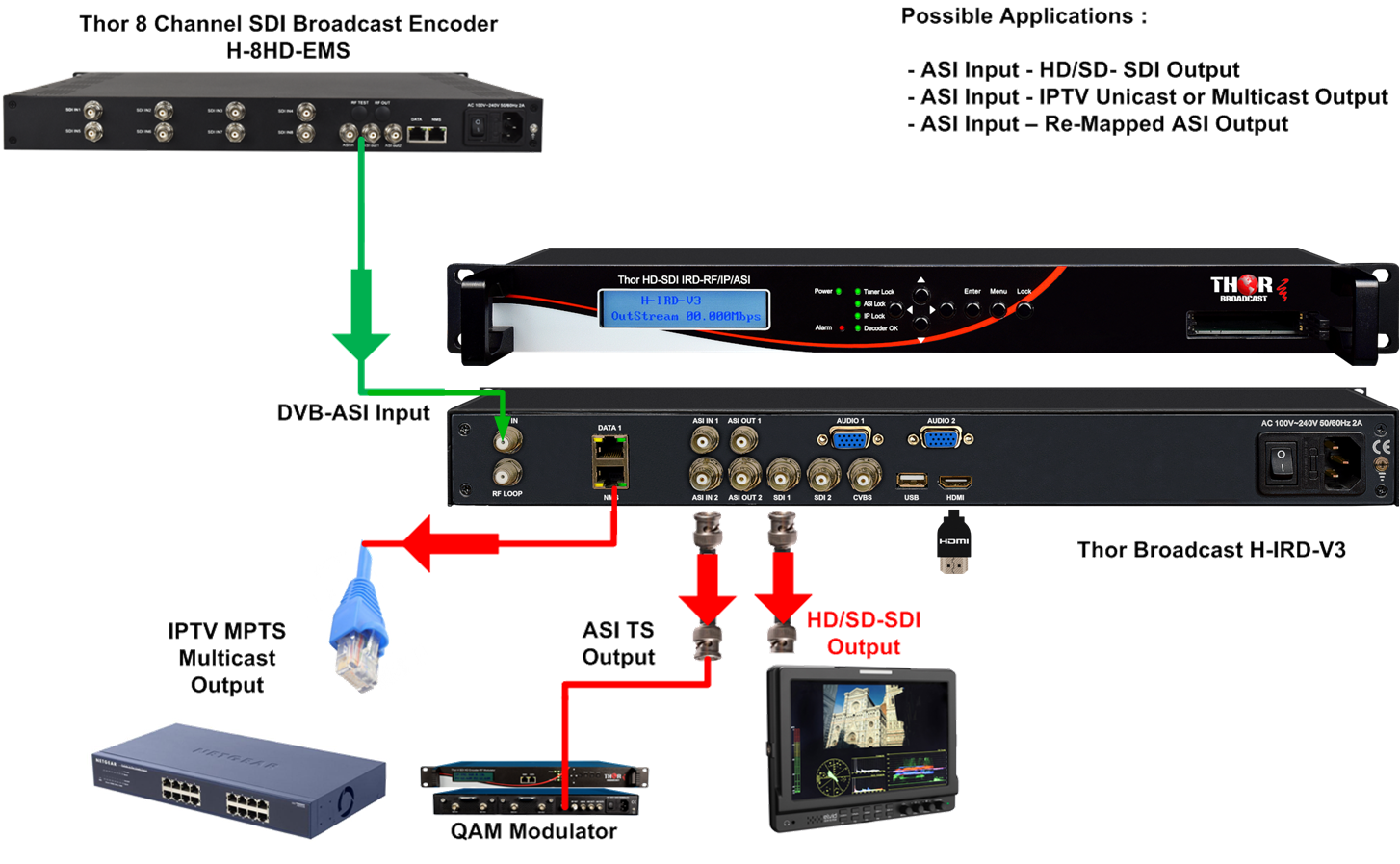 - ASI to VIDEO/AUDIO: Converts ASI streams to video formats like SDI, HDMI, CVBS, and YPbPr