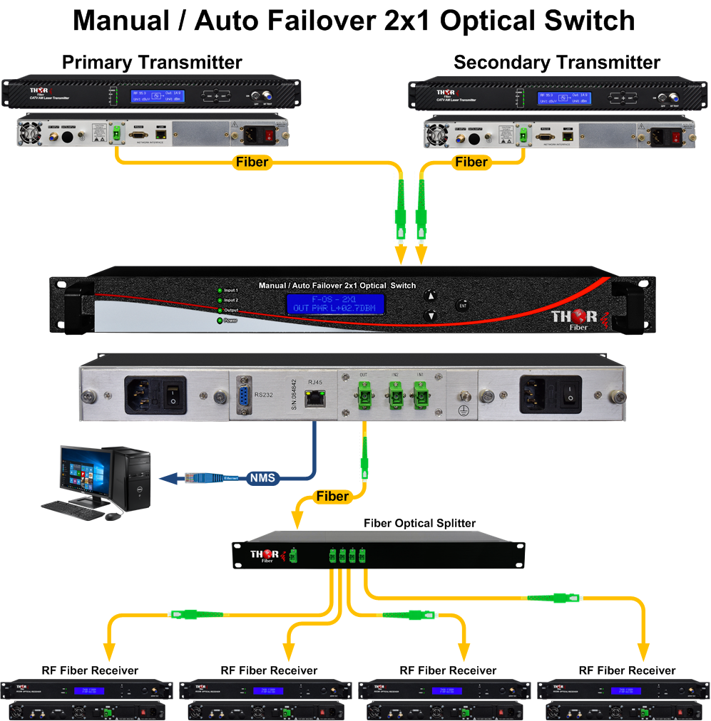 Enhance your system’s reliability with the Thor Managed Fiber Optic Switch, designed for seamless redundancy and backup. The F-OS Optical Switch efficiently routes redundant signals to active paths during faults, ensuring uninterrupted performance. With a low insertion loss of approximately 0.6dB, it supports versatile switching options: 1×2, 2×1, or 2×2. Its remote switching capability is ideal for managed systems, while the front panel LCD offers easy status monitoring and programming. Additionally, the F-OS is adaptable for CADM and OXC systems, providing flexible configuration options.