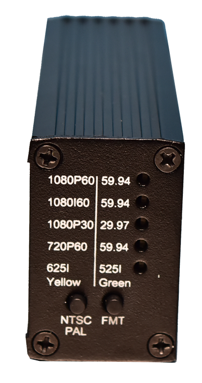 Equipped with an SDI format indicator LED, the device uses green to indicate NTSC and yellow for PAL. The panel interfaces include: